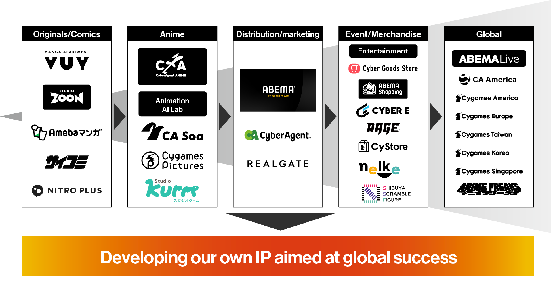 Seizing this vast opportunity, CyberAgent entered the anime sector a decade ago and has gradually built a comprehensive IP ecosystem. We have cultivated deep relationships within the industry through strategic investments and ABEMA-led marketing support. The establishment of the Anime & IP Business Division in 2024 marked a pivotal expansion. Respecting industry heritage, we have established a vertically integrated framework that enables us not only to invest but also to actively lead IP development.