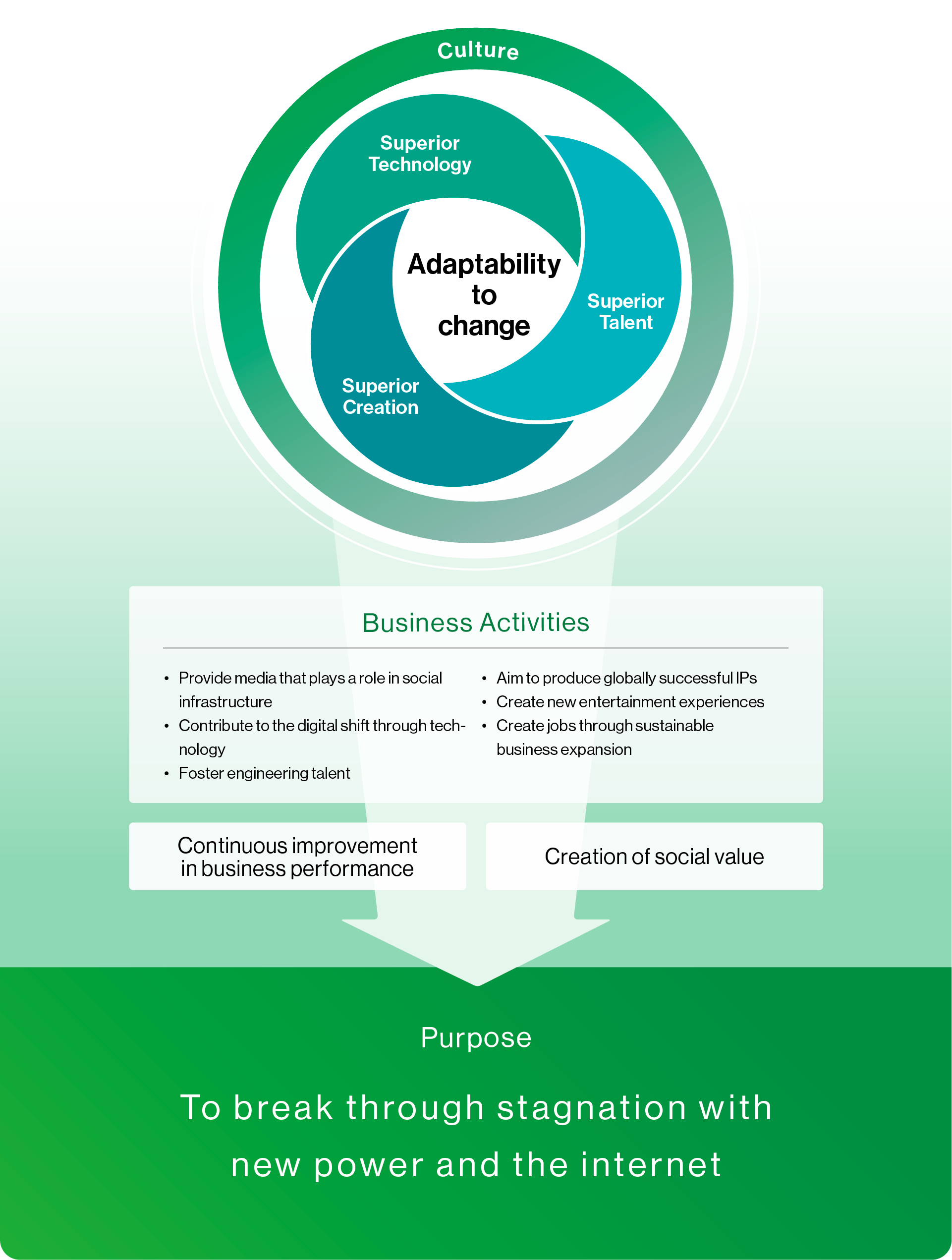 Guided by our Purpose—"To break through stagnation with new power and the internet"—we will continue to grow by embracing challenges alongside every employee. We are committed to contributing to Japan's industrial development by creating significant value through our diverse portfolio of internet services.
