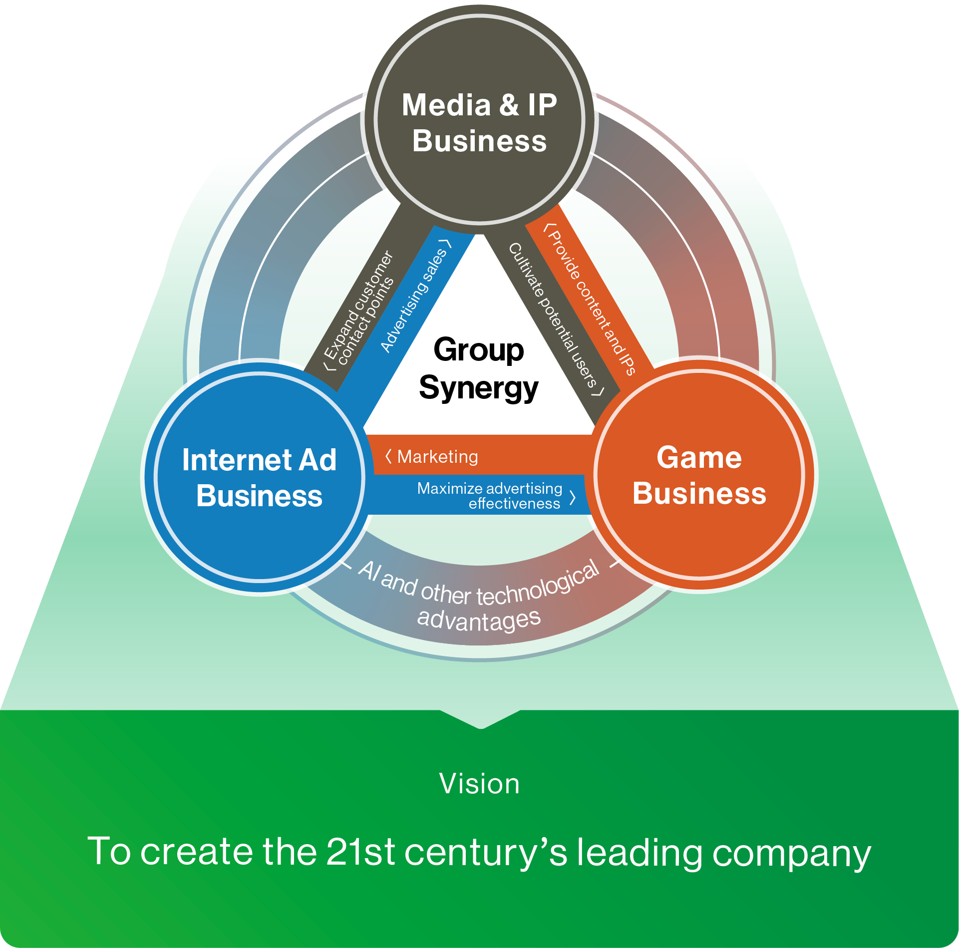 With our Vision "To create the 21st century’s leading company," we have cultivated talent to lead our businesses in line with the changing times. Our business portfolio now encompasses the Internet Advertising Business, the Game Business, and the Media & IP Business, centered around ABEMA. Our growth has been consistently fueled by enhancing group-wide synergies. Looking ahead, we will concentrate the Group's full capabilities on the challenge of creating original IP to establish a more solid and sustainable revenue foundation.