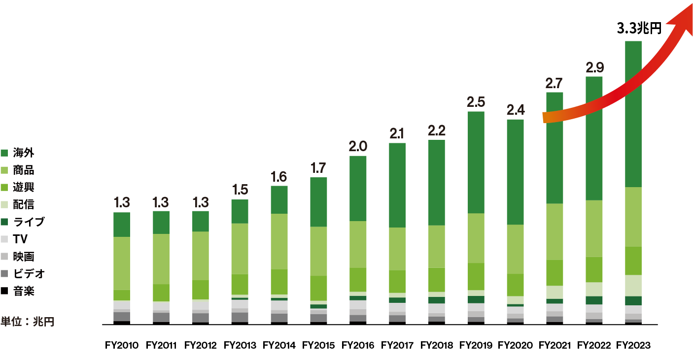 日本発のコンテンツ産業は、今や鉄鋼や半導体といった主要産業の輸出額を上回るほどの「基幹産業」へと成長しています※1。なかでもアニメ市場の成長は著しく、2023年には市場規模が過去最高の3.3兆円※2に達し、初めて海外市場が国内を上回りました。この成長は今後も続くと予想しており、2033年には約2倍の6.2兆円※3を超える規模となることが期待されています。また、日本政府もコンテンツ産業全体の輸出額を2033年に20兆円規模へ拡大する目標を掲げており※4、アニメ市場がこの成長を牽引する重要な役割を担うことが期待されています。