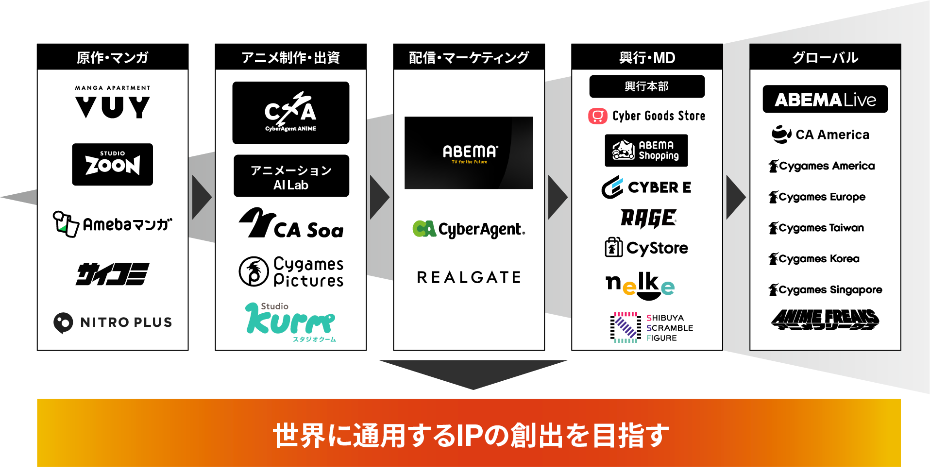 当社はIPを原作から制作し、興行、マーチャンダイジングなどの多様なマネタイズまでを一気通貫できる体制を構築しており、その中核を、各分野で専門性を持つグループ会社が担っています。