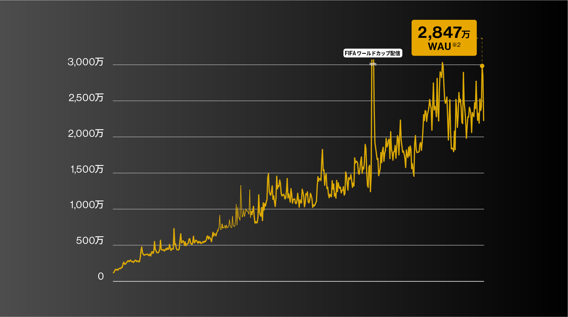 10年目を迎えた「ABEMA」は、コンテンツ制作および調達などへ積極的に投資を続け、メディアとしての存在感を高めてきました。現在は、人気スポーツやアニメ、ニュースに加え、オリジナル番組の視聴が人気を博し、2,800万を超える高いWAU※1にて推移しています。